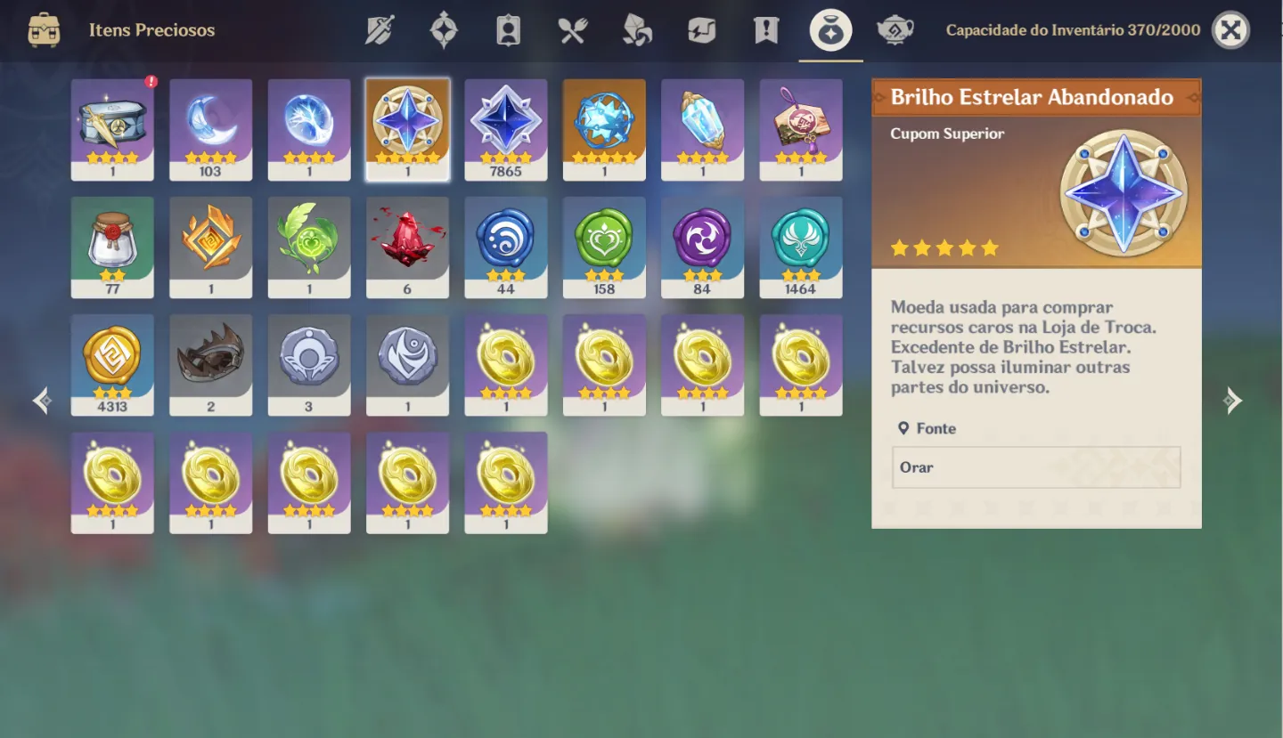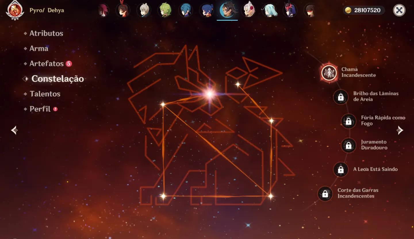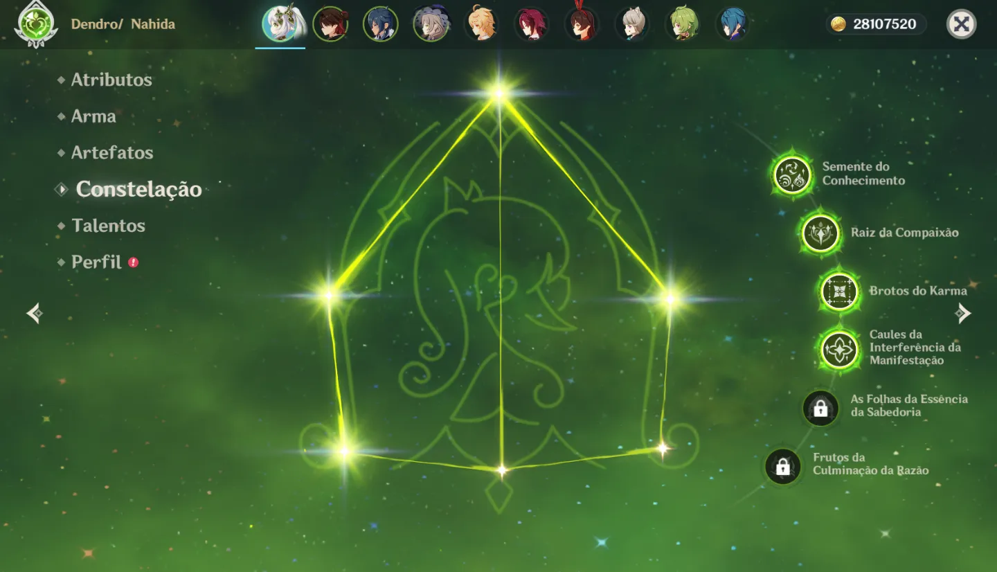 Conta reroll com Dehya c1 e Nahida c4 AR 51, com bastante resina frágil para usar.